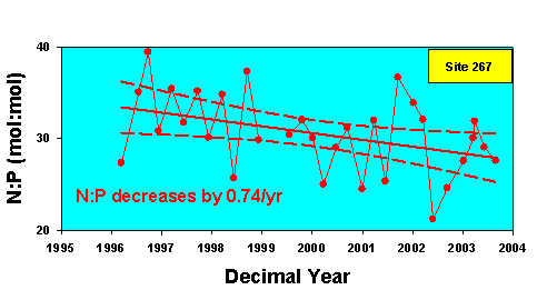 At 4 nearshore Level 1 sites in the Florida Keys, there has been an increase in the relative abundance of macroalgae over the period 1995 - 2003 that is consistent with an increase in nutrient availability. At none of these has there yet been a decrease in seagrass abundance, but our conceptual model predicts that increases in fast-growing macroalgae should precede decreases in seagrass abundance (Figure 2). One example, from site 235 offshore of Lower Matecumbe Key, shows how macroalgae have steadily increased in abundance over the monitoring period (Figure 4). In addition to these sites where relative abundance of primary producers has changed, at 4 more Level 1 sites there have been long-term shifts in the ratio of nitrogen to phosphorus in seagrass leaves that are consistent with increases in nutrient availability (Figure 5).