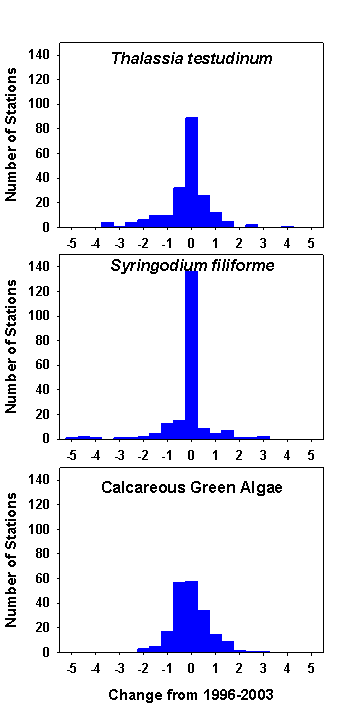 Resurveying the Level 2 and Level 3 sites revealed no spatially consistent patterns in changes in relative abundance of seagrass communities from throughout the sanctuary. The mean changes in Braun Blanquet density for the major taxa for the period 1996 and 2003 were not significantly different from zero (Figure 7), but there were some locations that had large differences between 1996 and 2003. Whether these changes were real changes in the benthic communities or artifacts caused by small scale spatial heterogeneity is currently being investigated. There were some areas, like around Islamorada, that showed declines in Thalassia in a large area contiguous with