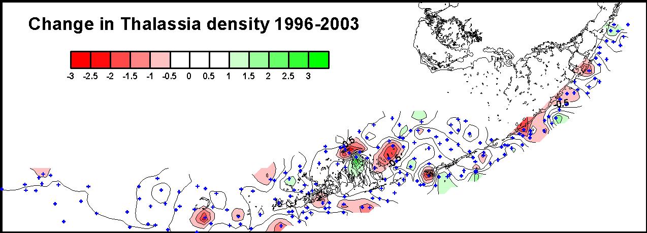 | Figure 8. Spatial pattern in the changes in the Braun-Blanquet density of Thalassia testudinum at Level 2 and Level 3 sites surveyed in 1996 and revisited in 2003. |